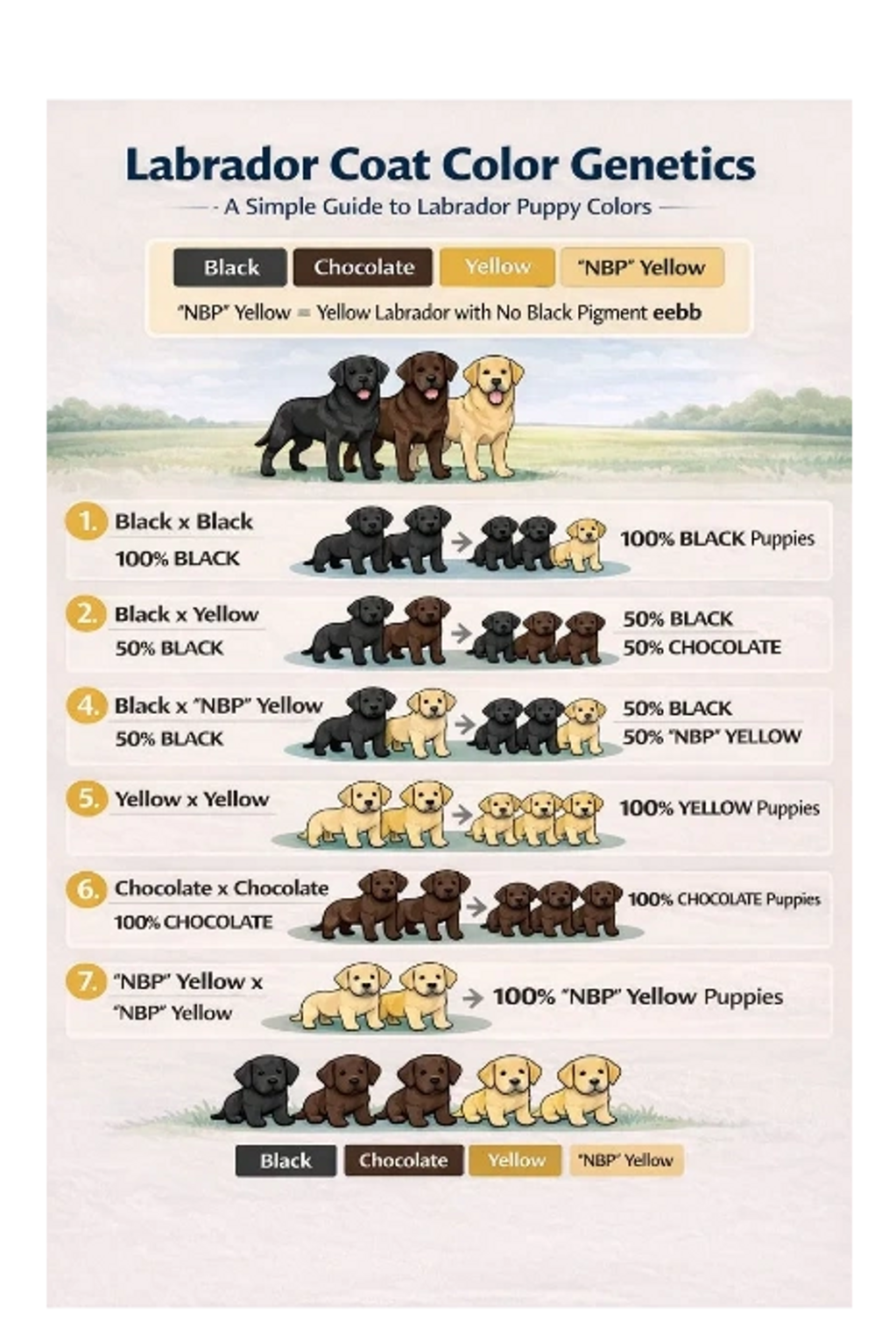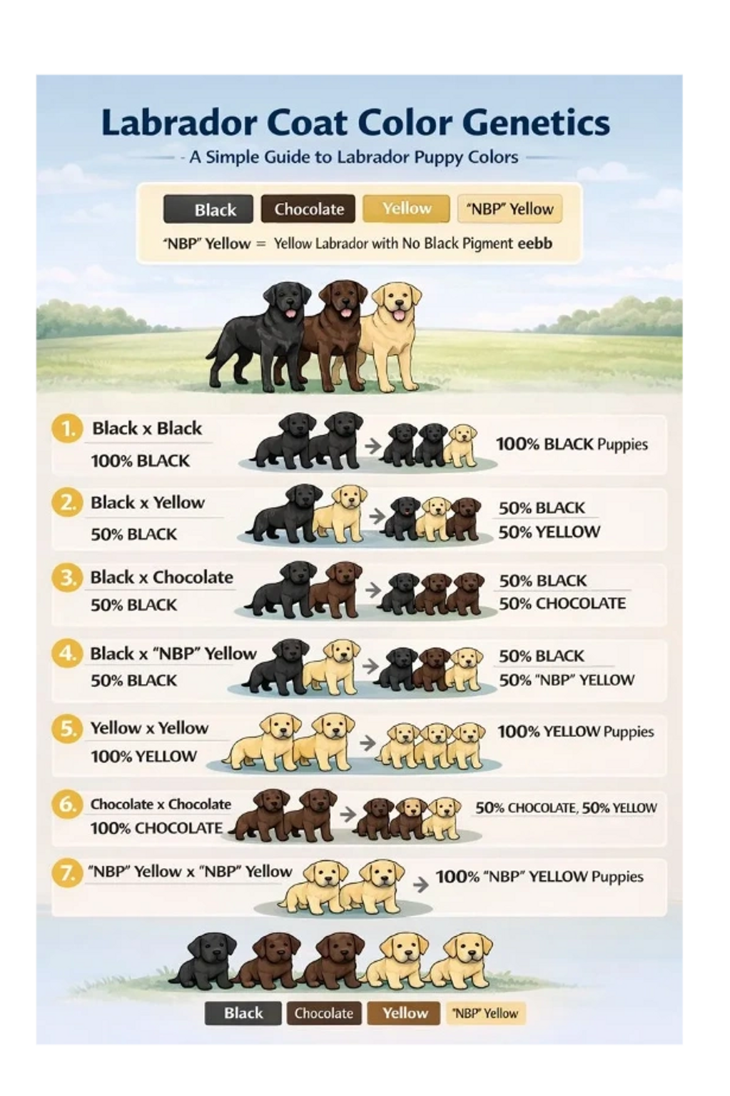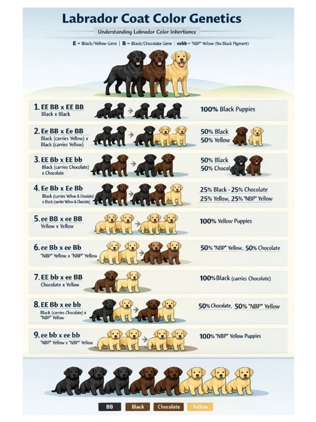 GenotypeColorE_B_BlackE_bbChocolateeeB_Yellow (black nose)eebbYellow with chocolate nose (often called “NBP”)